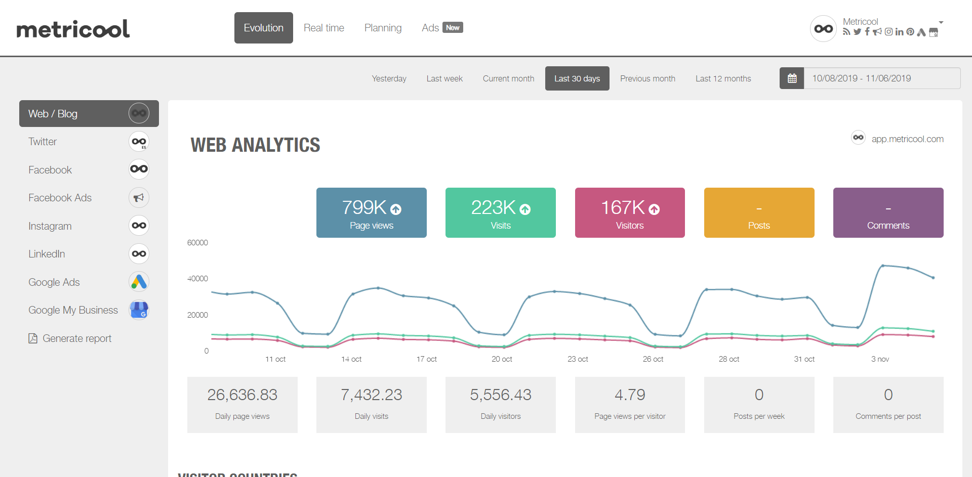 En muchas ocasiones, nos perdemos entre números y analíticas que realmente no necesitamos en algunos casos. Aquí todo está unificado, los más importantes, como pueden ser los datos de tu web, redes sociales y publicidad online. Algo muy útil que también podemos hacer es el Benchmark, es decir, una comparativa con tus competidores, para que puedes ver qué y como lo están haciendo ellos, por que es importante conocer nuestro propio negocio, pero también el de la competencia. Las métricas las puedes consultar cuando quieras, pues los datos se quedan almacenados (excepto en la versión gratuita que solo se almacenan durante 3 meses).Publicidad online